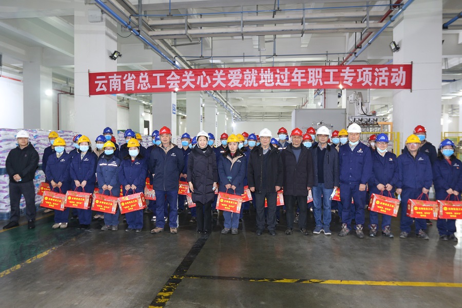 昆明盐矿 报道 2月9日,云南省总工会党组成员、经审会主任张松、法律和维权工作部部长张泽平、经审办一级主任科员耿望博一行到所属昆明盐矿开展关心关爱就地过年职工专项活动,向为了生产和疫情防控不能回家过年的一线职工送去温暖和关怀。能投集团党委副书记江萍、工会副主席张梅陪同慰问。